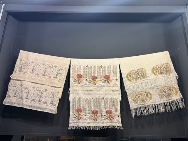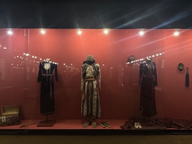 The first room focuses on Armenian textile art and the various embroidery and lacemaking traditions. From the museum signage, displayed in both Armenian and English, one can learn that embroidery and lace making are some of the oldest and longest-practiced areas of Armenian folk art, going back hundreds of years, and that it has been a longstanding folk tradition to decorate nearly all household textiles with intricate embroidery or lace. There are numerous lacemaking techniques displayed, from needle lace to bobbin lace and crochet, each with its particular history and household use explained. Embroidery too had a wide range of styles and traditions, from simple cross stitch, to the delicate white Ayntap embroidery, to the intricately colorful Marash embroidery. The embroidery room also showcased several sets of Armenian traditional costumes and accessories like belts, headbands, and shoes.