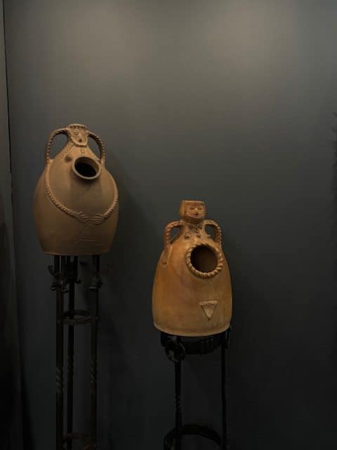 The second room showcases Armenian silver and metalwork. Metalwork has held a unique place in Armenian heritage and is used both as a decorative art and for the making of household items like cookware and vessels. Much of this room is taken up by an impressive collection of traditional jewelry, which would accompany the traditional costumes of the previous exhibit room. The jewelry is made in an intricate silver filigree style, adorned with gemstones and elaborately constructed. Many motifs are inspired by nature, with pieces often depicting floral and botanical designs as well as more geometrical and abstract constructions. These decorative techniques are also applied to objects like dagger sheathes, small boxes, and numerous household goods from goblets to trays to cookery. Part of the metalwork exhibit showcases the art of Vahan Hatsagortisian and Artzruni Berberyan, two 20th-century metal artists who were each inspired by their native Armenian folk traditions and who both played significant roles in preserving as well as reimagining Armenian metalwork.