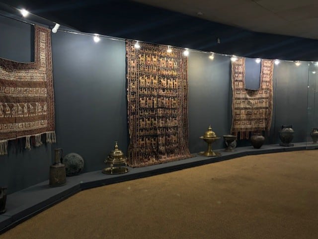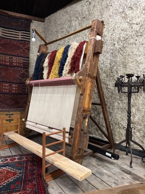 The museum has an impressive collection of traditional Armenian rugs. They are spread out through the various rooms in the museum, with the main exhibit in a downstairs hall that also displays a large traditional loom, demonstrating how such looms would occupy a traditional Armenian home. Armenian carpets are traditionally crafted from pure wool and feature deep, rich colors and unique folk motifs. Many of these rug patterns are primarily geometric in nature with repetitive designs, but there is also a long practice of incorporating images from nature and folklore and even animals and human figures in Armenian rugs. Some rugs depict dragons, a significant element of Armenian folklore.