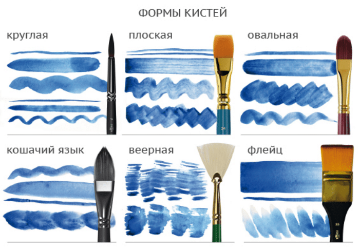 Artists typically use кисти (paintbrushes) but might also use мастихины (palette knives), шпатели (spatulas), тряпки (rags), губки (sponges) or even their пальцы и/или ладони (fingers or hands) для достижения желаемого эффекта (to achieve the desired effects). Paintbrushes themselves come in various forms, including круглые (round), плоские (flat), овальные (filbert), и веерные (fan). More modern artists might use an аэрограф (airbrush), трафарет (stencil), баллончик с краской (spray can), or стилус (stylus).